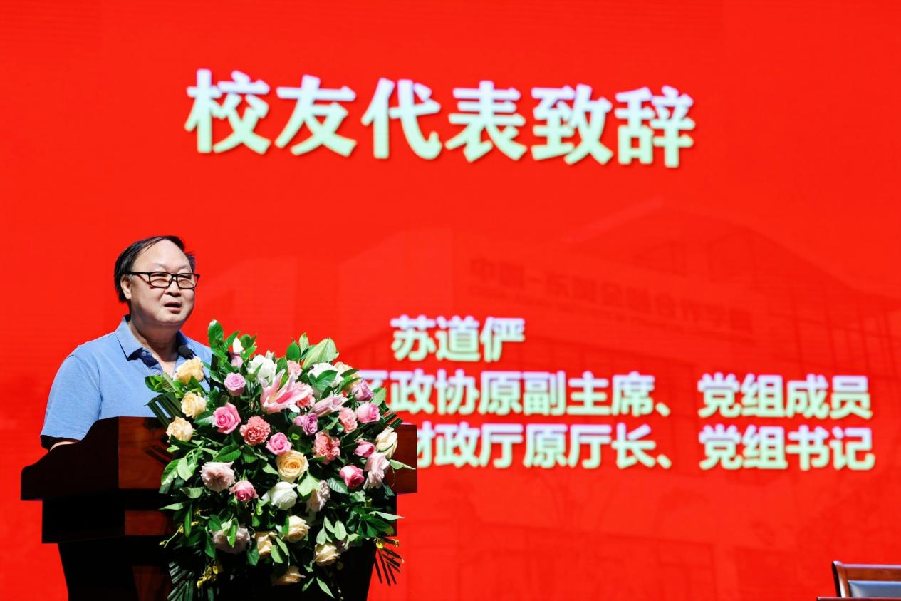 杰出校友,广西壮族自治区政协原副主席、党组成员,广西壮族自治区财政厅原厅长、党组书记,财政部驻广西壮族自治区财政监察专员办事处原监察专员、党组书记苏道俨致辞。苏道俨校友1986年进入h视频