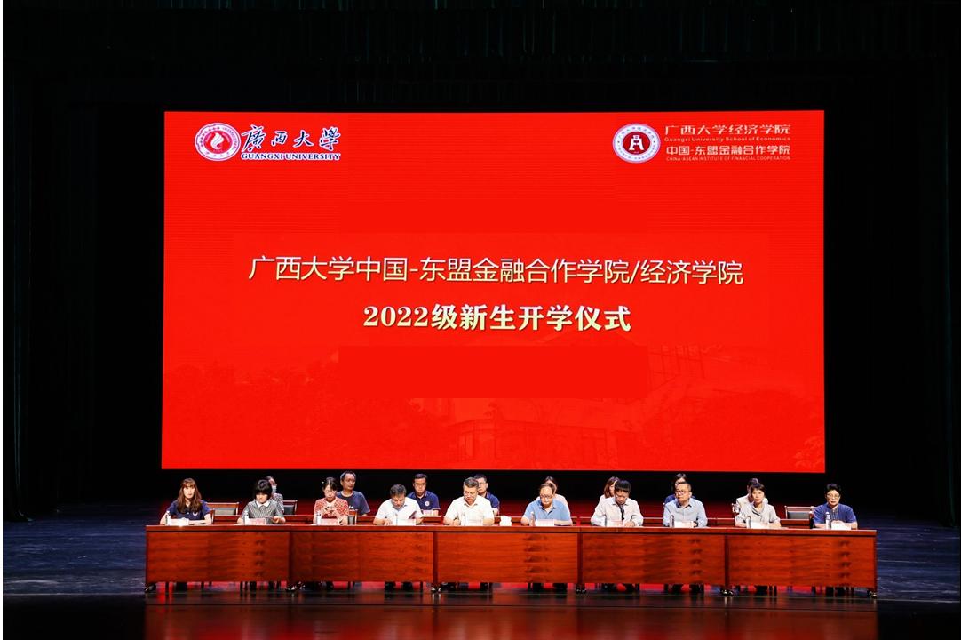 院长(兼)田利辉,学院杰出校友、广西壮族自治区政协原副主席、广西壮族自治区财政厅原厅长苏道俨出席开学仪式,学院党委书记陆善勇及院党政领导班子、各系系主任、教师代表、行政各部门负责人与429名2022级新生、200名其他年级学生参加本次仪式。开学仪式由院党委书记陆善勇主持典礼。