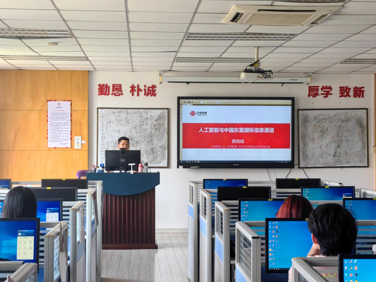 国际经济与贸易系在《电子商务理论与实践》课程中创新开展校企联合教学实践,邀请中国联通广西分公司网络运营部高级总监黄焕成走进本科课堂,以“行业专家+场景教学”模式,为学生带来《人工智能与中国东盟国际信息通信》专题授课。