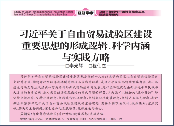 李光辉教授、程仕杰博士研究生撰写的论文《习近平关于自由贸易试验区建设重要思想的形成逻辑、科学内涵与实践方略》在《经济学家》2024年第1期(总第301期)正式发表。