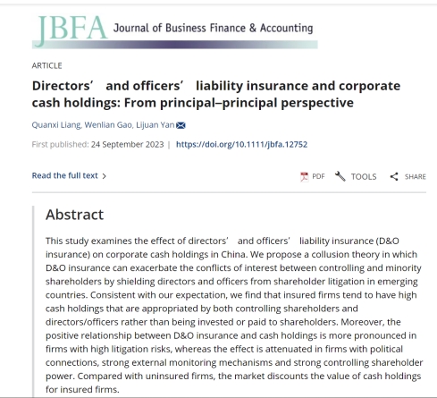 梁权熙教授和美国北伊利诺伊大学高文莲(Wenlian Gao)助理教授、北京联合大学闫丽娟助理教授合作的论文“Directors' and Officers' Liability Insurance and Corporate Cash Holdings: From Principal–principal Perspective”在财经类国际权威期刊Journal of Business Finance & Accounting接受发表。