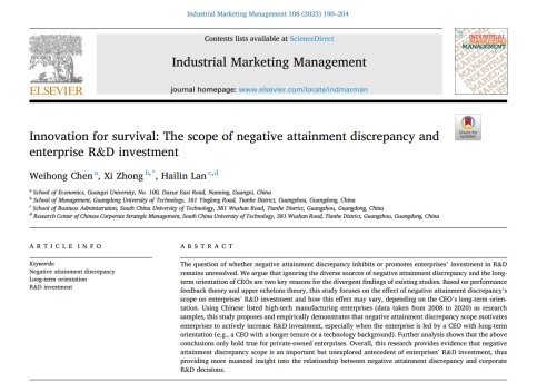 陈伟宏助理教授与广东工业大学钟熙博士以及华南理工大学蓝海林教授合作撰写的学术论文“Innovation for survival: The scope of negative attainment discrepancy and enterprise R&D investment”(《为生存而创新:负向成就差异的范围与企业研发投资》)在《Industrial Marketing Management》(2023, 108: 190-204)正式发表。
