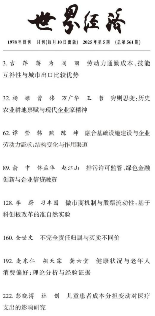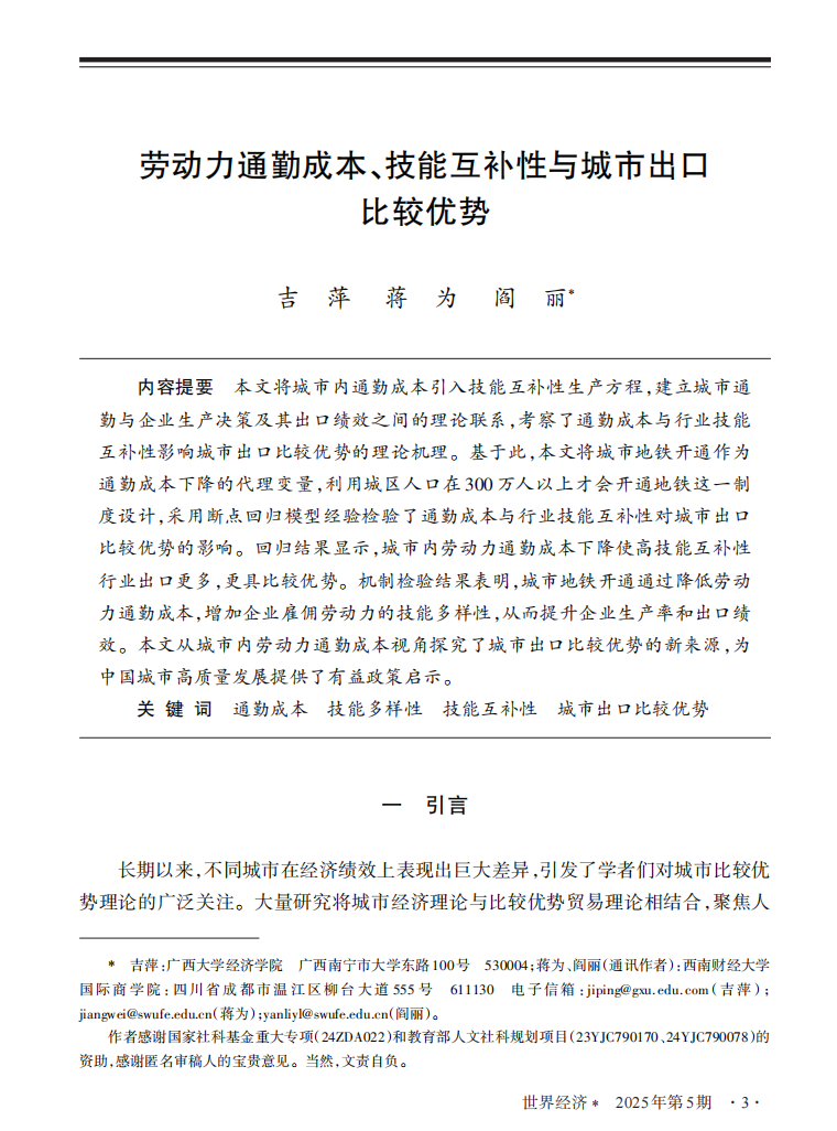 助理教授吉萍与西南财经大学教授蒋为、讲师阎丽合作的论文《劳动力通勤成本、技能互补性与城市出口比较优势》在《世界经济》期刊2025年5月刊发表。