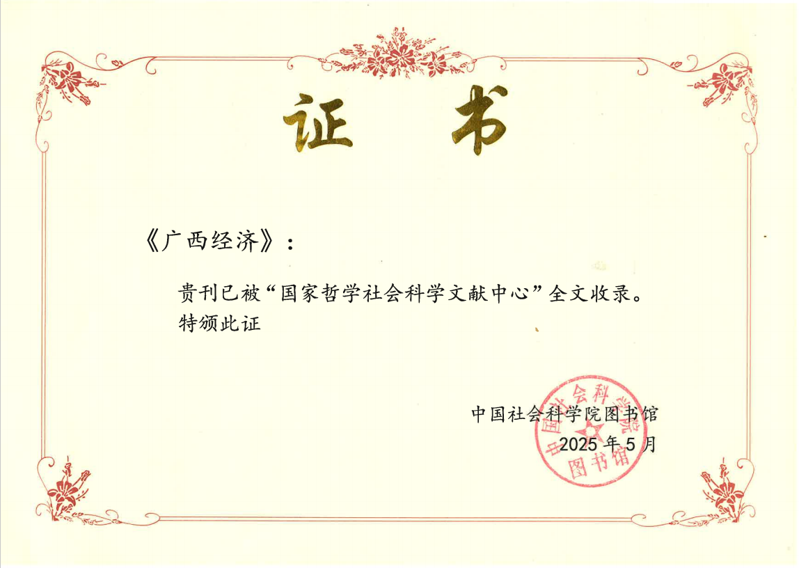 《广西经济》入库国家哲学社会科学文献中心,所有文献在国家级学术期刊平台上实现开放获取,优秀文献会被重点推送,将有力促进《广西经济》的学术交流与传播,也进一步坚定了《广西经济》打造具有边疆和中国-东盟特色学术期刊的信心和决心。《广西经济》将继续与广大学术同仁一起,不断提升期刊学术质量、学术影响力、学术引领力,推动《广西经济》向更高质量发展。