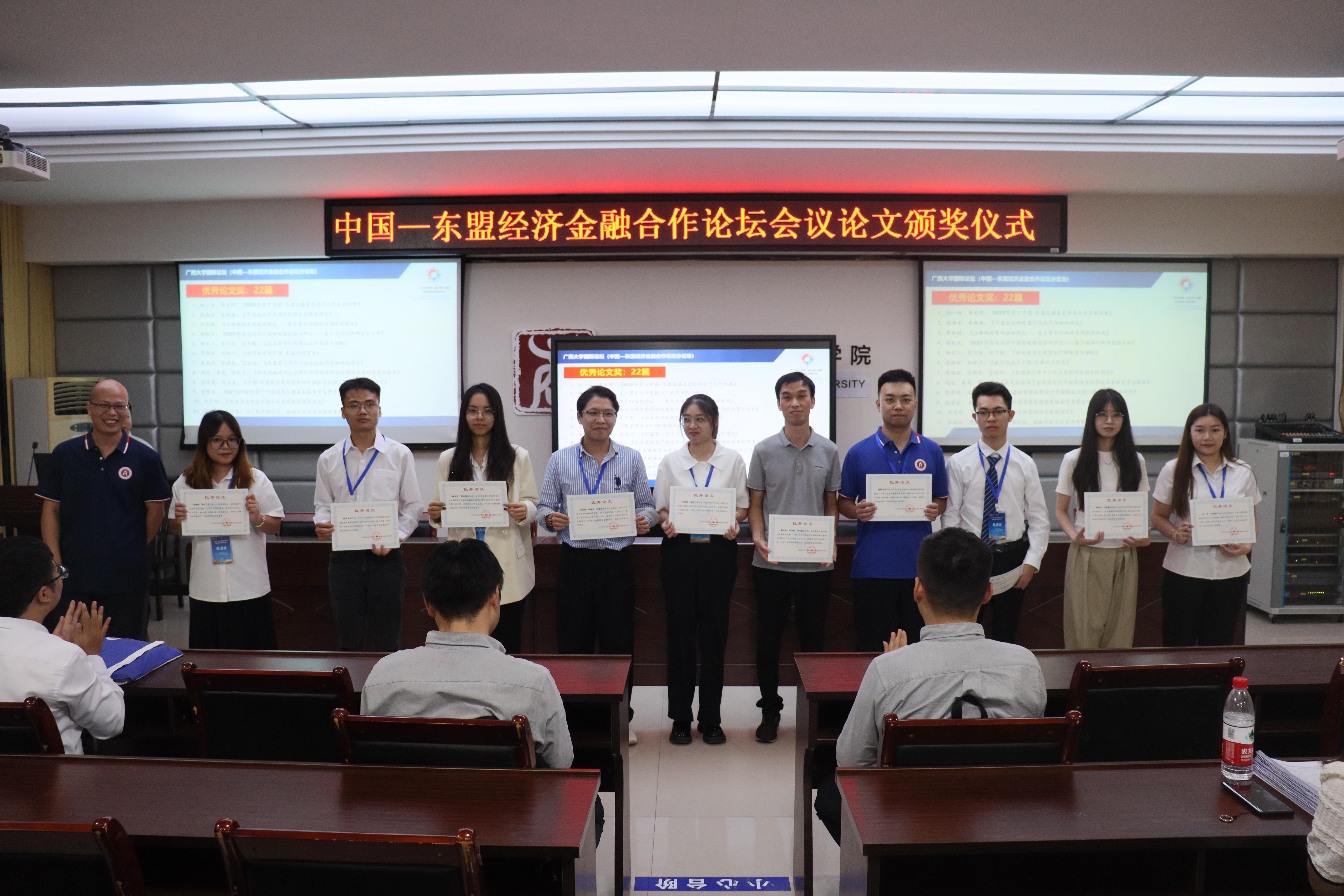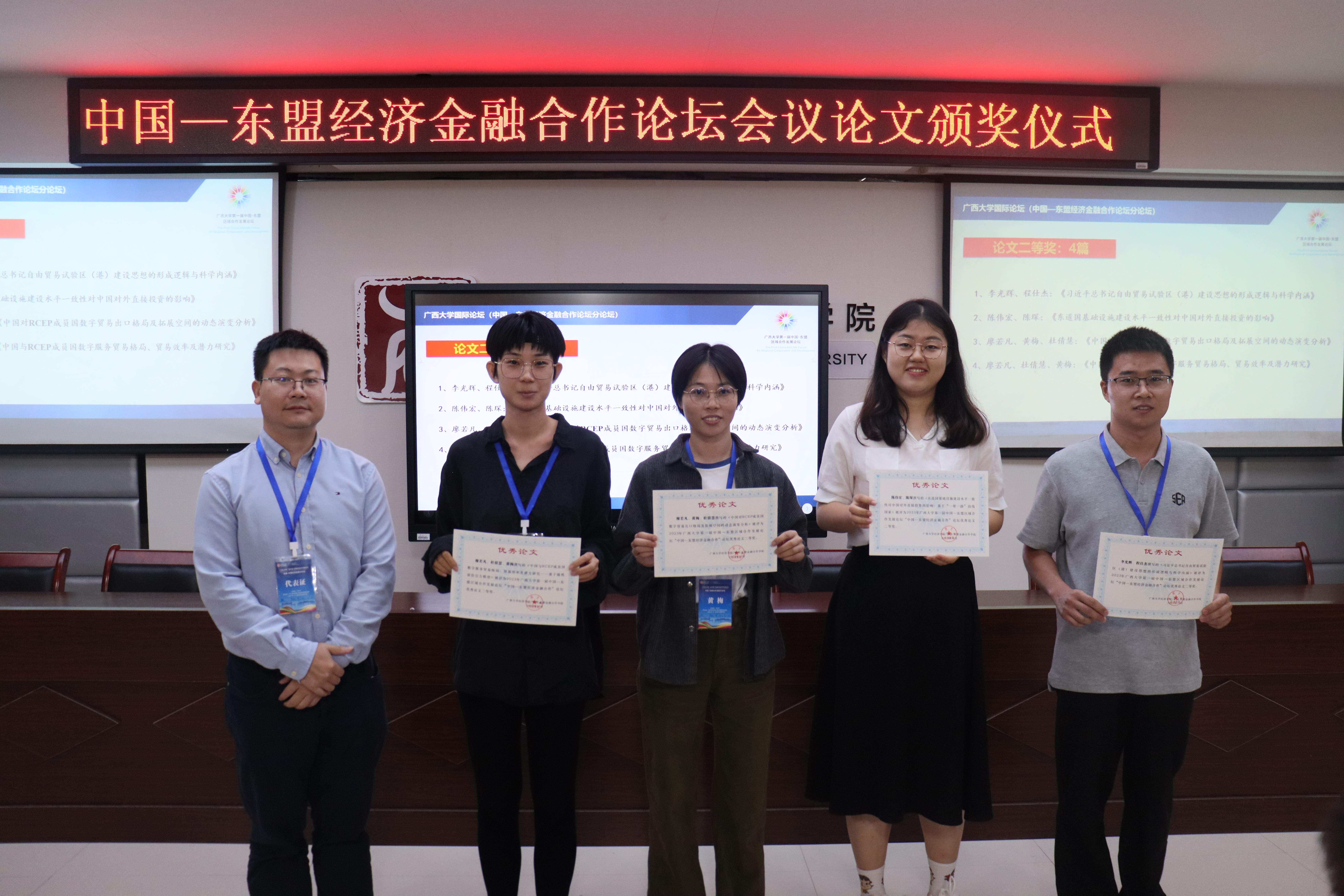 本次论坛的征文得到了来自区内外高校师生的积极响应。15日下午,论坛举办“自贸区与服务贸易”“国际贸易与投资”“金融发展与合作”三个学术平行论坛,从会议投稿中选取了《东盟国家新能源政策的就业效应研究》等34篇优秀论文,进行宣读和专家点评。最后,在MBA大楼124报告厅举行了隆重的优秀论文颁奖仪式,由金融财政支部书记陈新建主持,学院副院长梁权熙,院长助理刘骞文、毛薇及金融系主任谢军为获奖论文作者颁奖。