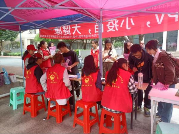 青年志愿者协会于3月11日至12日在西校园6B小广场成功开展了以“预防HPV,小疫苗,大健康”为主题的预防HPV科普活动。此次活动吸引了众多同学参加,现场气氛十分活跃,获得了良好的宣传效果。