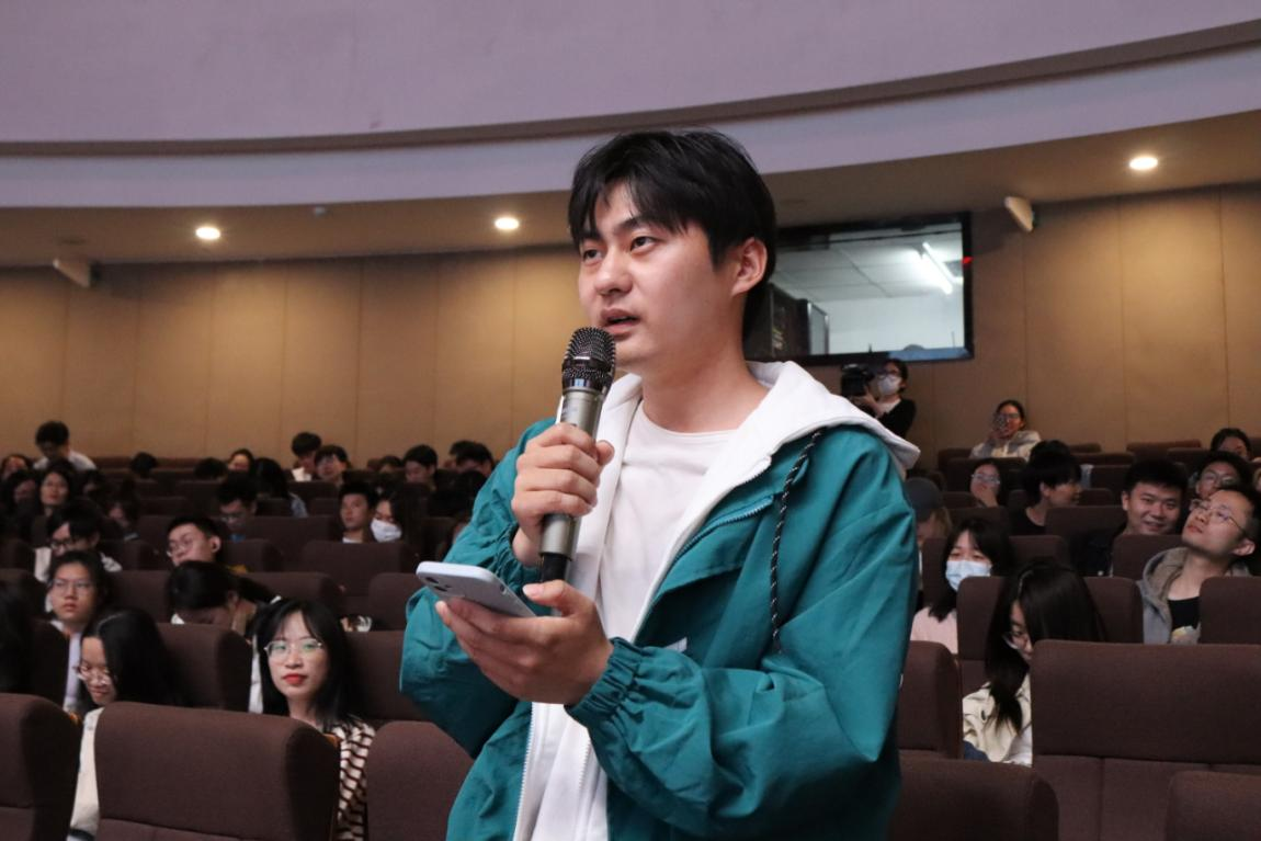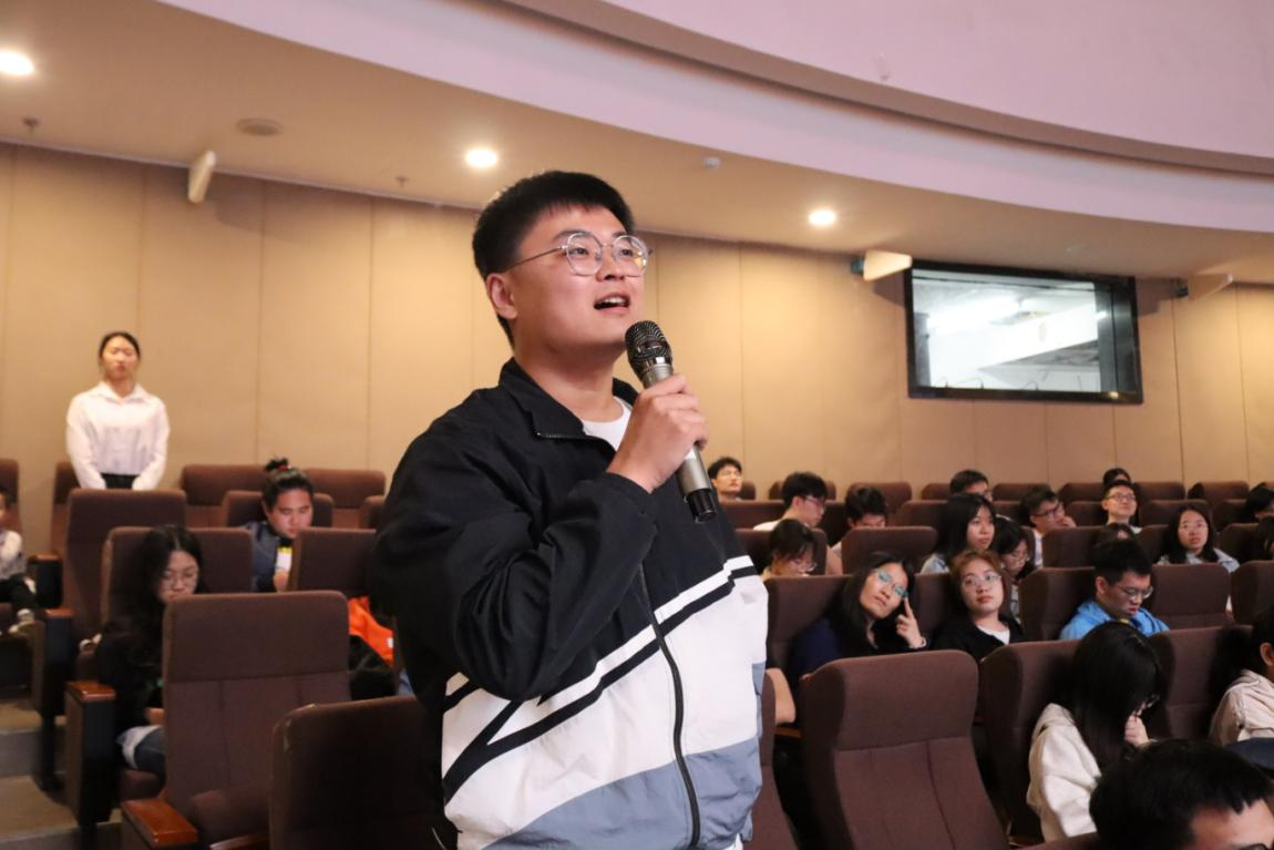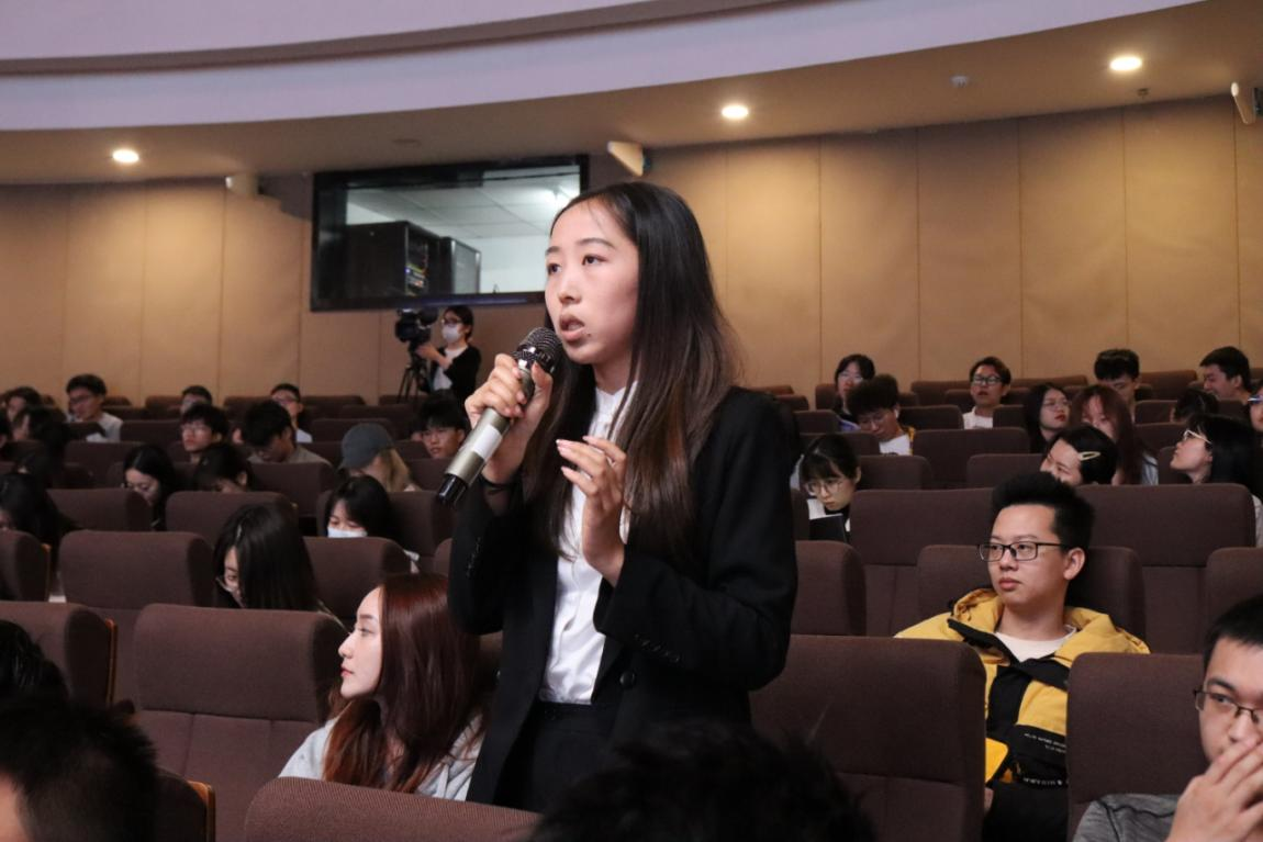 七位金融青年的生动分享引发了同学们的深切思考与共鸣。为了让廉洁教育既打预防针,告诉同学们什么不能做,也打强心针,告诉同学们什么应该做,畅聊会设置了互动交流环节。同学们结合各自关切的一些热点话题大胆求问,既有毕业论文、各类考试考证等学业压力,又有职业生涯发展规划上的一些迷茫;既有对金融行业专业能力、综合素质要求高的担忧,又有结合自身个性如何快速适应银行、保险工作岗位的焦虑;既有对人工智能、ChatGPT在金融行业应用等热点的关注,又有对当前金融监管体制改革的关切。围绕青年学子们关心的话题,与会嘉宾以知心大朋友和学长学姐的身份与同学们进行了深入坦诚的交流。有的以年轻人喜闻乐见的脱口秀、追剧弹幕等小切口拉进彼此距离,共同研判后疫情时代年轻人容易出现的迷茫、焦虑与困惑;有的围绕党的二十大报告中“加强和完善现代金融监管”宣介金融监管体制改革的重要意义;有的以学霸身份分享学习考证心得体会;有的从专业角度指导如何做好步入金融行业的准备;有的以切身经历分享如何从一名职场新手成长为业务骨干,帮助同学们理清思路、建立信心、勇毅前行。台下学子积极发问,台上嘉宾踊跃回应,领导讲、干部讲、老师讲、学生讲,现场互动气氛热烈。对年轻人的思想教育和引领,也在这一问一答、你一言我一语中潜移默化、润物无声。