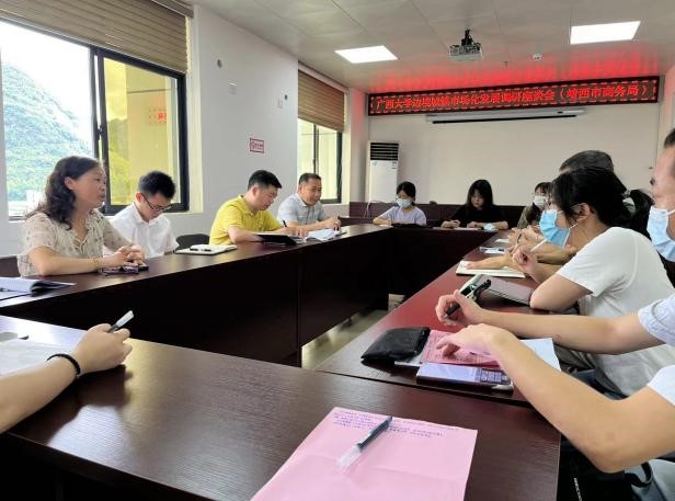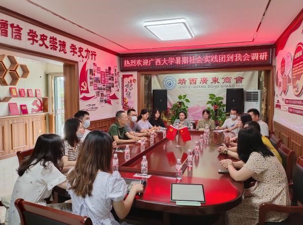 实践团师生还与当地商务局、广东商会取得联系。在7月15日上午,实践团在商务局7楼会议室举行座谈会,商务局三位局长及两位主任出席会议。在会上商务局赵局长为同学们讲解了当前靖西市经济发展现状及未来发展规划,表明靖西商贸未来发展将与电商结合,实现线上线下多渠道购销。但就目前情况而言,要发展还存在人才匮乏的问题,今后将把重点放在培养、发掘当地人才上。在自由提问环节实践团成员向各位领导询问了如何刺激靖西市消费、如何帮扶当地企业度过疫情难关等问题,主管内贸和市场建设的彭主任就提出的问题为同学们讲述了当前靖西市市场体系建设遇到的困难、未来破局方向以及当地针对疫情能够给予企业的支持政策。商务局的领导们都表示,在疫情下,当地的经济受到强烈冲击,但政府会尽力帮助当地大小企业度过难关。下午,实践团前往靖西市广东商会,商会执行会长李丽君,常务副会长张喜见等六位重要领导出席了座谈。在座谈中,李会长简要介绍了商会的自身建设、开展公益行动方面等基本情况。随后,参加座谈的商会领导介绍了自身企业的基本情况、企业优势、企业前景、环境优势以及发展中遇到的问题等,并就实践团成员关注的h视频、就业环境、就业待遇、人才需求情况等问题给予了深入细致的回答。