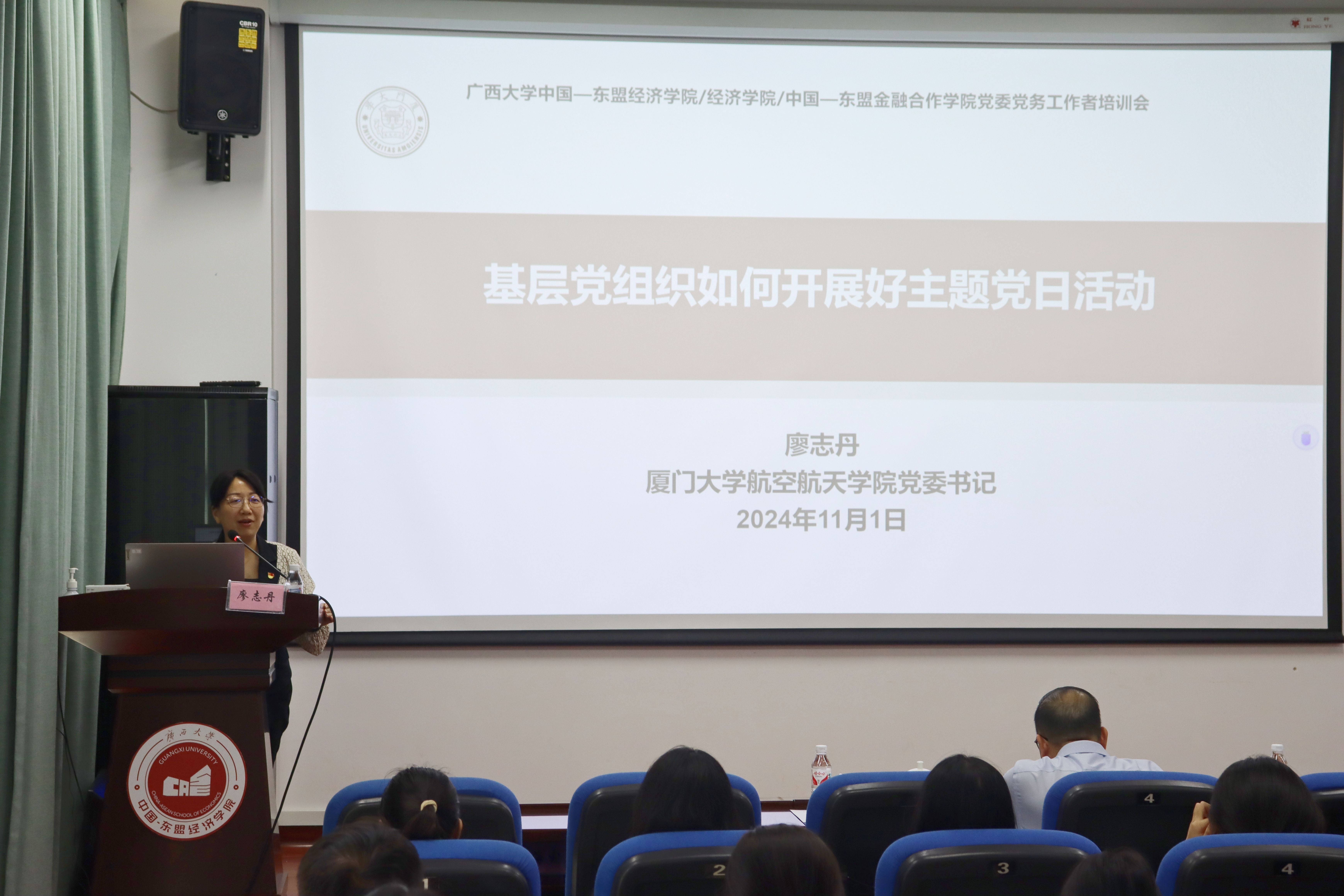 培训会上,廖志丹以《基层党组织如何开展好主题党日活动》为题,从立足“高”字强站位、立足“实”字夯基础、立足“变”字求创新、立足“效”字显成果等四个方面为大家作了一场透彻深入、鲜活生动的党务工作经验分享报告。她指出,基层党建重在活动、重在制度、重在人心。基层党务工作要严格按照党中央要求,将“三会一课”、主题党日活动、谈心谈话等制度不折不扣落实,在执行过程中,既要做到严肃党内生活,又要做到工作有温度、服务暖人心。她结合自身多年来的党建工作实践和心得体会进一步讲述了开展主题党日活动的思路设计、方式创新、活动载体、品牌打造等,图文并茂、绘声绘色的讲述引发在场师生的共鸣和思考。大家纷纷表示,廖志丹书记的精彩分享对做好基层党建工作具有很强的针对性和指导性,将积极借鉴和学习优秀基层党组织的先进经验和做法,创新工作思路和方法,推动h视频