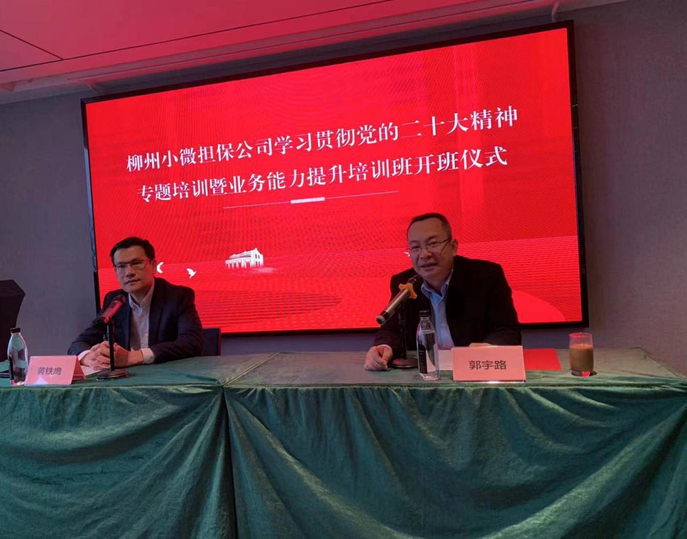 2023年首个面向广西地方金融机构管理人员的金融业务能力培训班。柳州市小微企业融资担保有限公司黄铁鹰董事长、学院党委副书记、副院长郭宇路出席开班仪式并致辞。