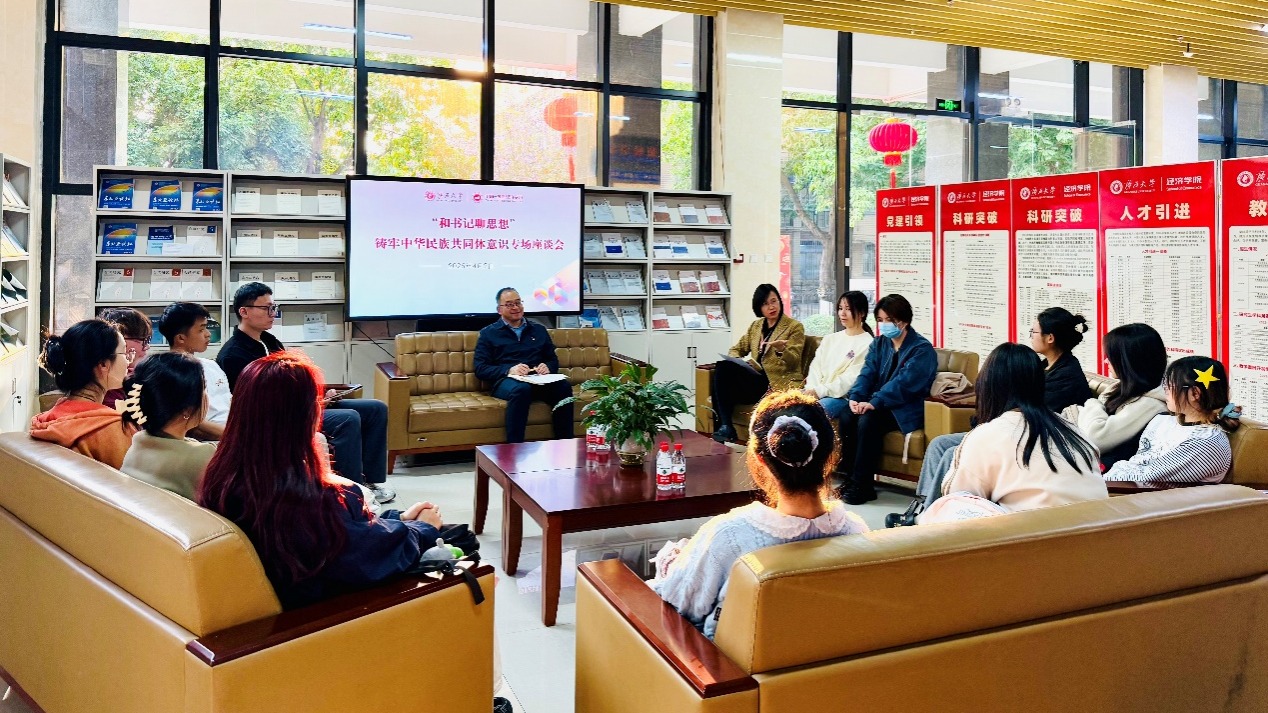 党委在学院一楼大厅举办“和书记聊思想”——铸牢中华民族共同体意识专场座谈会。学院党委常务副书记罗诚与各民族学生代表一起共话民族团结情谊。学院团委书记王海希、辅导员郭霖刚参加座谈会。