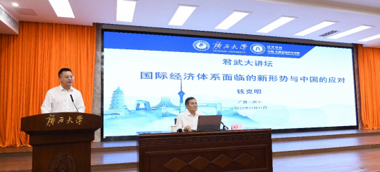 君武馆玉林厅举行。本讲座由全国政协常委、科技教育卫生体育委员会副主任、全国国际商务专业学位研究生教育指导委员会主任委员担任主讲人,报告主题为“国际经济体系面临的新形势与中国的应对”。h视频