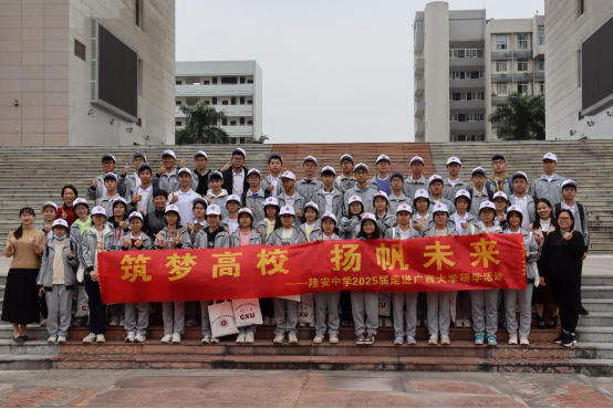 第五站,隆安中学师生跟随志愿者开始打卡大学校园,从西校园到东校园依次参观了时光广场、第六教学楼、碧云湖、大学生活动中心、劝学岛、崇左桥、西体育馆、汇学堂、大礼堂、综合楼和育才广场,学生们纷纷感叹我校景色优美宜人、学习氛围浓厚。
