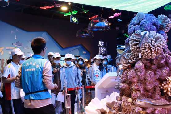 (讲解员带领隆安中学同学们参观海洋馆)