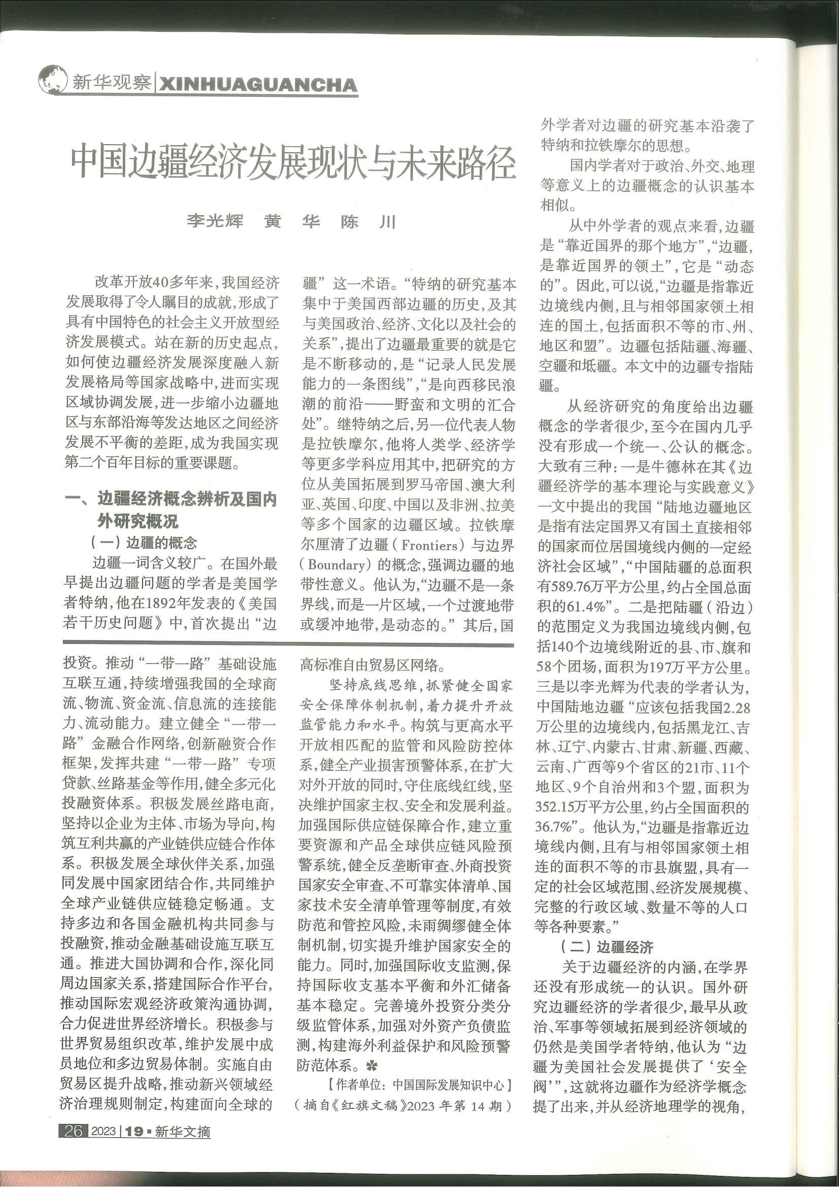 h视频 李光辉教授、黄华博士研究生撰写的论文“中国边疆经济发展现状与未来路径”全文被《新华文摘》(2023年第19期)转载,该论文曾发表在《中国经济报告》(2023年第3期)。