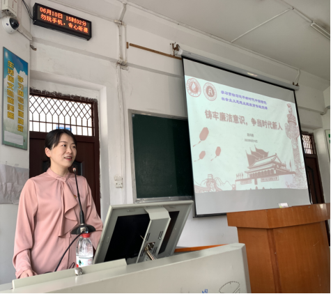 陈卉娟副书记从思想与实践两个层面引导学生党员们树立廉洁自律理念,铸牢廉政思想共识和价值追求。她强调,清正廉洁是中华民族的传统美德,是社会主义核心价值观的重要内容,更是立德树人的重要要求,是大学生成长成人的基石。新时代青年一定要树立正确的世界观、人生观和价值观,筑牢理想信念的压舱石,重视修炼抵御腐败的免疫力、增强心理素质,自觉抵制各种不正之风,筑牢拒腐防变的精神堤坝。要注意在日常生活中加强自我教育与自警自省,守好政治关、权力关、交往关、诚信关和纪律关这“五关”,把个人目标与报效祖国和人民的宏愿相结合,提高自身道德、自律意识,增强克己奉公的角色意识和为人民服务的担当意识,树立廉洁理念、彰显廉洁本色、弘扬廉洁风尚。
