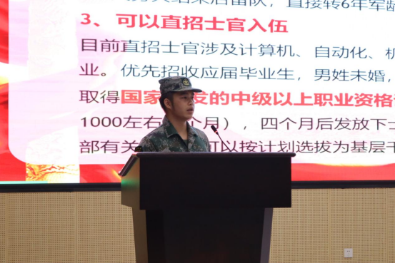 退伍大学生欧志伟为同学们介绍了应征入伍相关政策。陈榕平老师强调,到部队锻炼身体、磨练意志、锤炼品质、开阔眼界是青年人生中不可多得的宝贵经历,从军得到的收获是做其他事不能代替的,而且国家现在对于大学生入伍给予了很多优待政策,给个人未来发展免去了后顾之忧、提供了更多选择。他呼吁广大学子积极响应国家号召报名参军入伍,希望有志青年去军营塑造自我,为国防贡献力量。