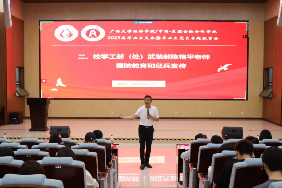 /中国-东盟金融合作学院2023届毕业生大会暨毕业生党员专题教育会在资源环境与材料学院123报告厅召开。学院党委书记陆善勇,党委副书记/纪委书记陈卉娟,学工部(处)、武装部陈榕平,学院团委书记王海希,团委副书记蒙江勇,辅导员蒙昀、覃晓阳、曾宪友、何湘桂出席本次会议,2023届全体毕业生与会。