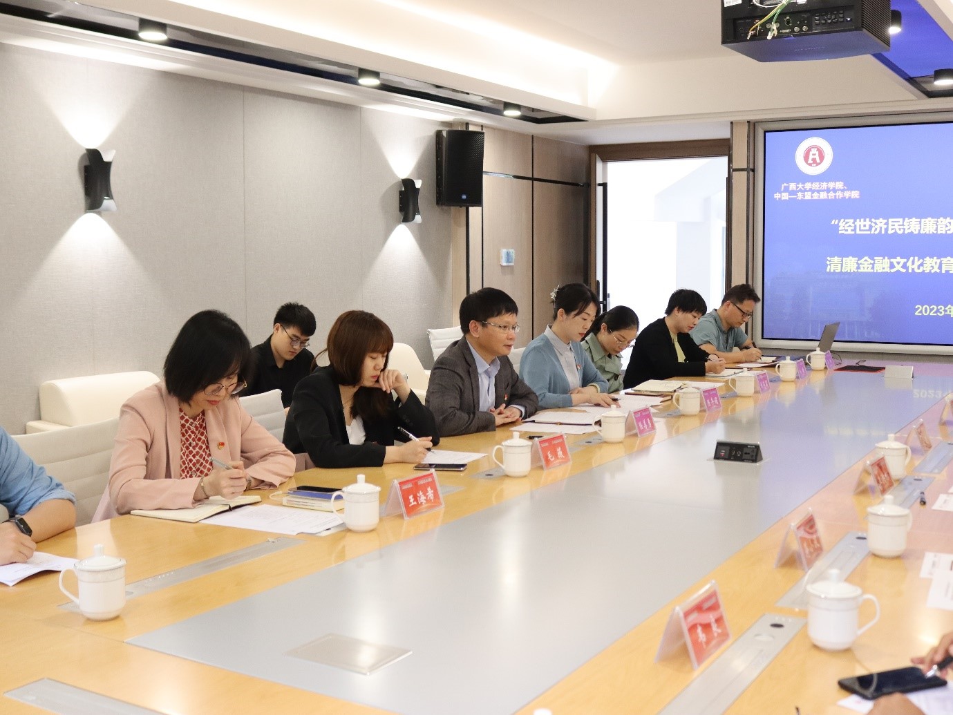 党委、纪委委员和师生代表与来宾在学院102会议室召开了主题为“经世济民铸廉韵 银保清风润八桂”的清廉金融文化教育基地专题交流座谈会。h视频