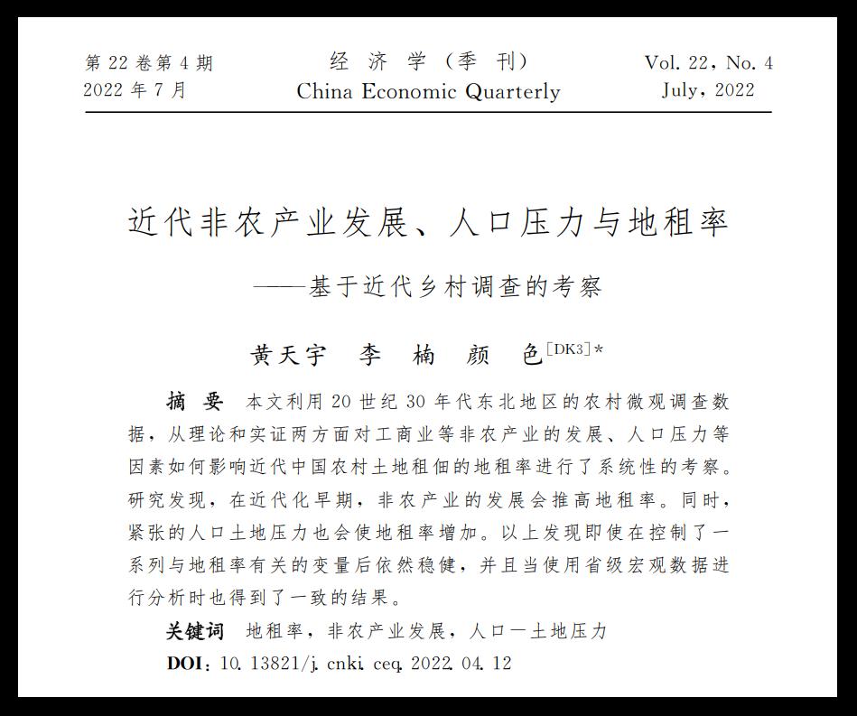 黄天宇、李楠、颜色的论文“近代非农产业发展、人口压力与地租率——基于近代乡村调查的考察”发表在2022年7月的《经济学(季刊)》第22卷第4期。该论文利用20世纪30年代东北地区的农村微观调查数据,从理论和实证两方面对工商业等非农产业的发展、人口压力等因素如何影响近代中国农村土地租佃的地租率进行了系统性的考察。研究发现,在近代化早期,非农产业的发展会推高地租率。同时,紧张的人口土地压力也会使地租率增加。以上发现即使在控制了一系列与地租率有关的变量后依然稳健,并且当使用省级宏观数据进行分析时也得到了一致的结果。