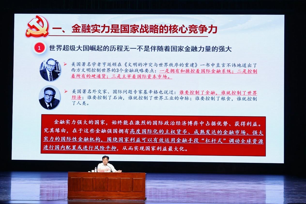讲座上,范世祥主任由金融的定义出发,从金融实力、金融制度、金融改革和金融安全四个角度深刻阐述了金融在提升国家竞争力、推动经济社会发展、深化供给侧结构性改革、保障国家安全中的关键地位和重要作用。范主任强调,金融在现代经济社会发展中有广泛的渗透度,几乎每一个产业、行业和领域都离不开金融。金融组织架构的完整性、业务服务的广泛性、产品创新的多样性和风险外溢的渗透性都是金融广度的具体体现。2018年7月,中共中央政治局会议首次提出“六稳”方针,即稳就业、稳金融、稳外贸、稳外资、稳投资、稳预期。其中,稳就业是基础,稳金融、稳外贸、稳外资、稳投资是手段,稳预期是目的。在这里,稳金融显然列为手段中的第一位。说明金融不是冷冰冰的数字游戏,而是有温度有情怀,知冷暖有感情,以此稳定融资、稳定信心、稳定预期。