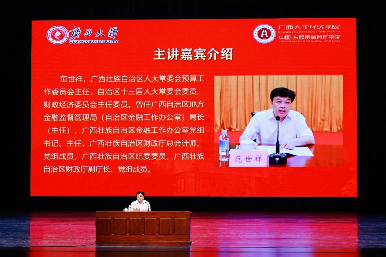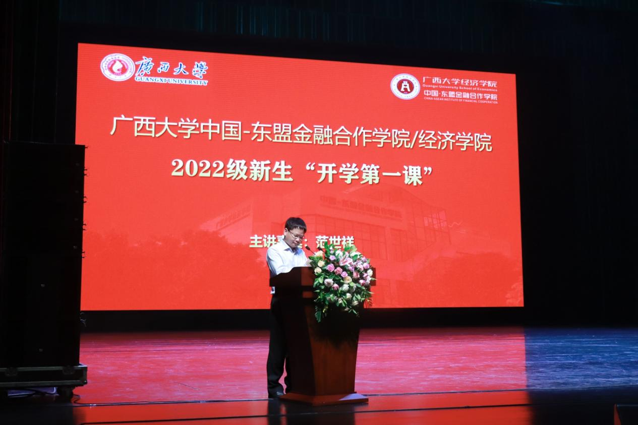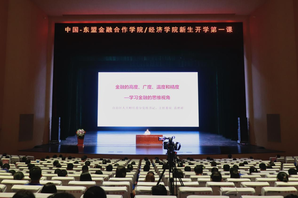 在汇学堂开展2022级新生开学活动,广西壮族自治区人大财经委分党组书记、主任委员范世祥为全院新生带来“开学第一课”:《金融的高度、广度、温度和精度——学习金融的思维视角》专题讲座。学院党委书记陆善勇主持活动。