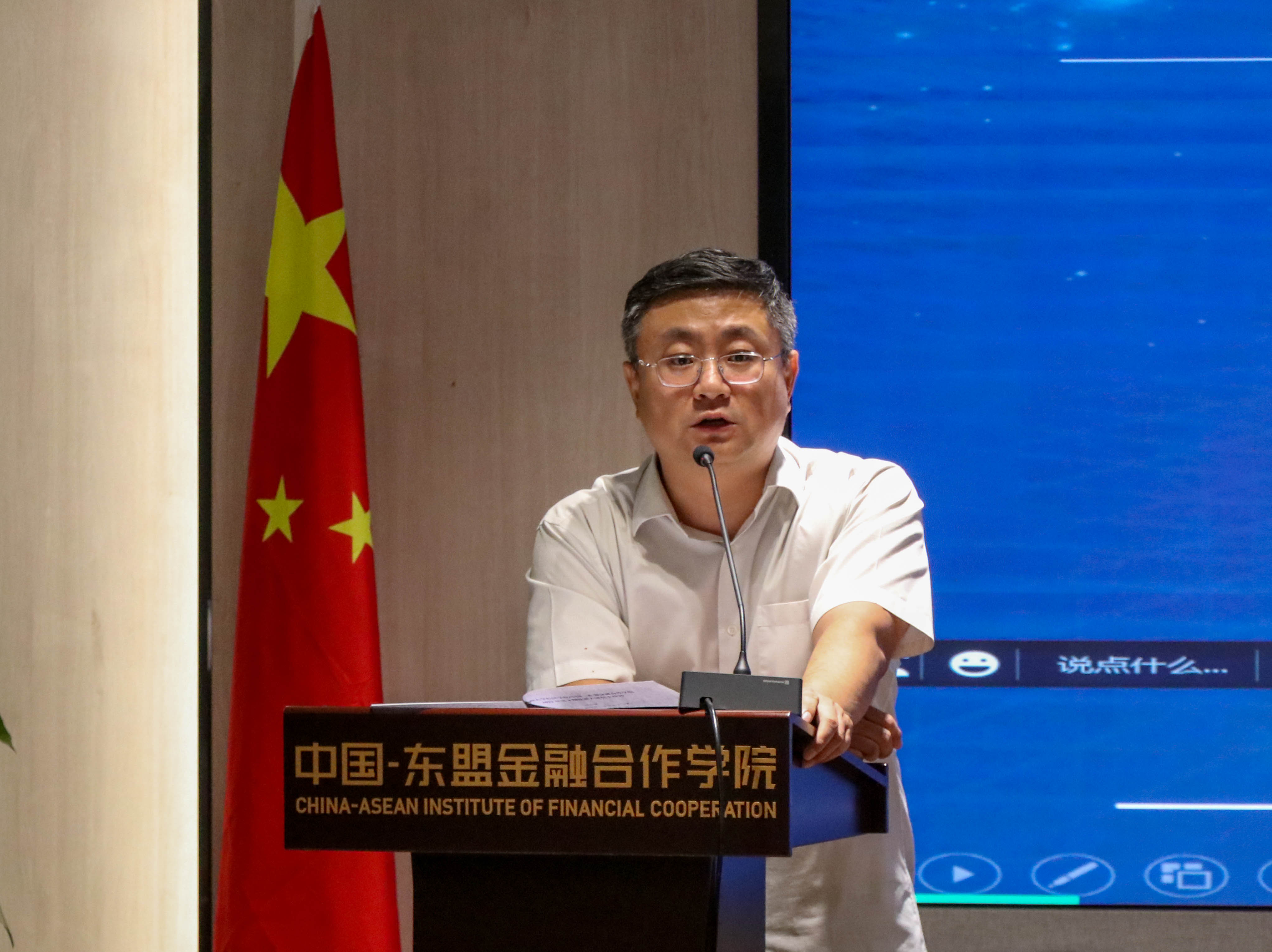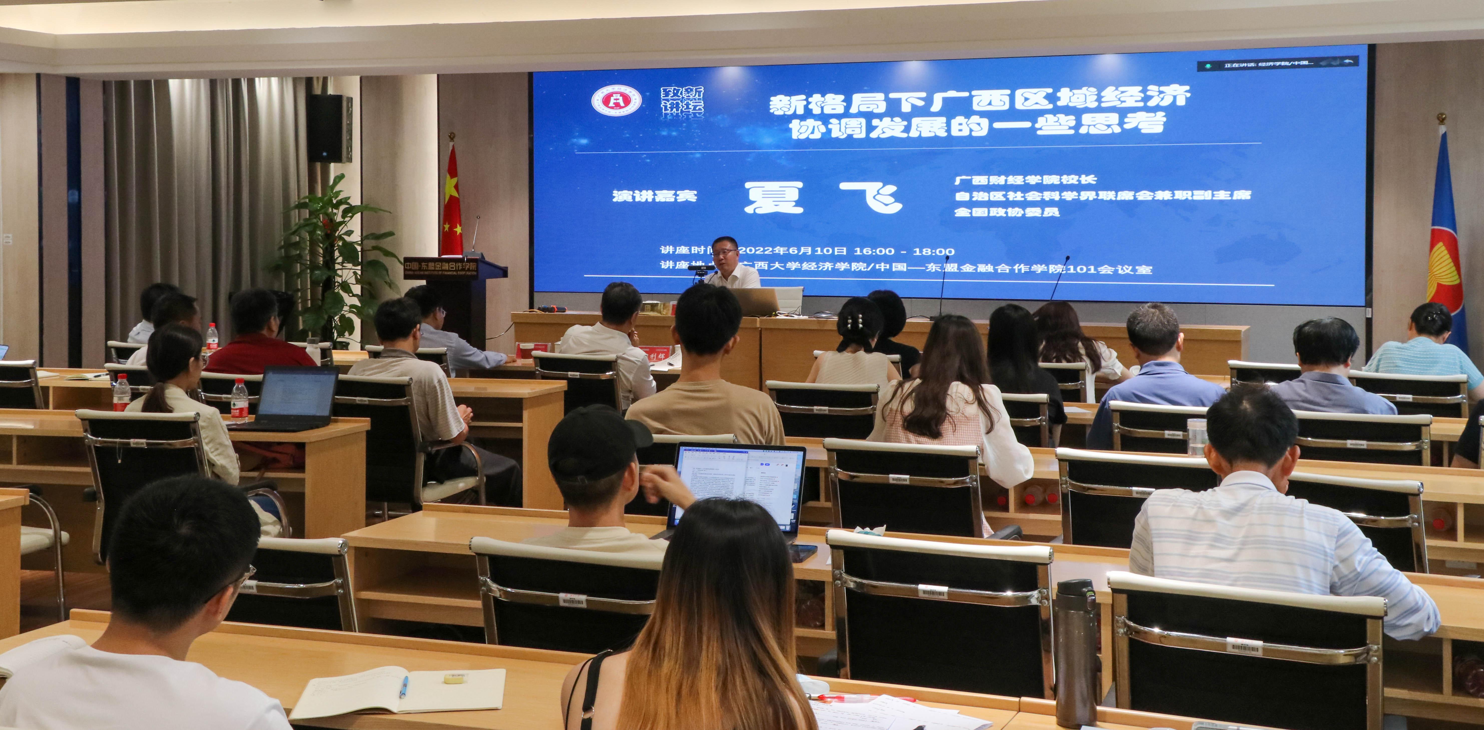 /中国—东盟金融合作学院2022年第4期“致新大讲坛”如期举行,广西财经学院校长、自治区社会科学界联席会兼职副主席、全国政协委员夏飞教授为学院上百名师生带来题为“新格局下广西区域经济协调发展的一些思考”的专题讲座。讲座以线下和线上结合的方式进行,我校党委常委、副校长、学院院长田利辉教授主持讲座。