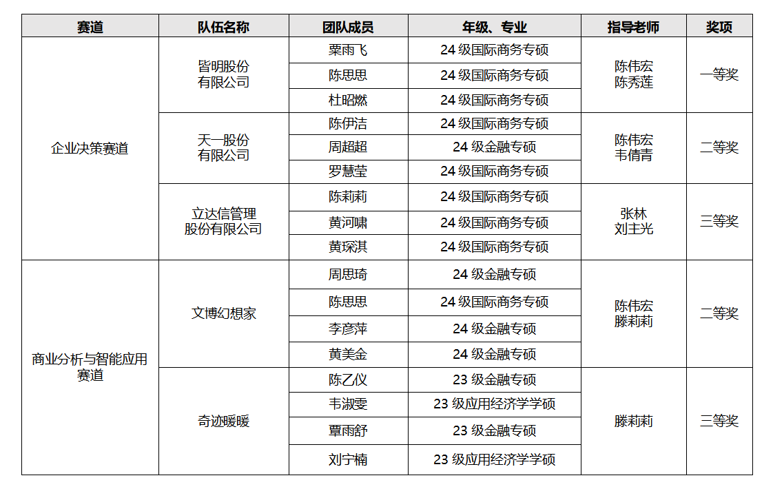 参赛选手在全国初赛、复赛中一路过关斩将,最终在总决赛中表现优异、力压群雄,一共斩获企业决策赛道全国一等奖1项(赛事最高奖项)、二等奖1项、三等奖1项;商业分析与智能应用赛道全国二等奖1项、三等奖1项。其中,企业决策赛道全国一等奖由陈伟宏、陈秀莲老师指导的h视频