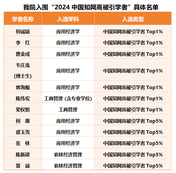 12位学者入选“2024中国知网高被引学者”名单。其中,7位学者入选“2024中国知网高被引学者Top1%”;5位学者入选“2024中国知网高被引学者Top5%”。