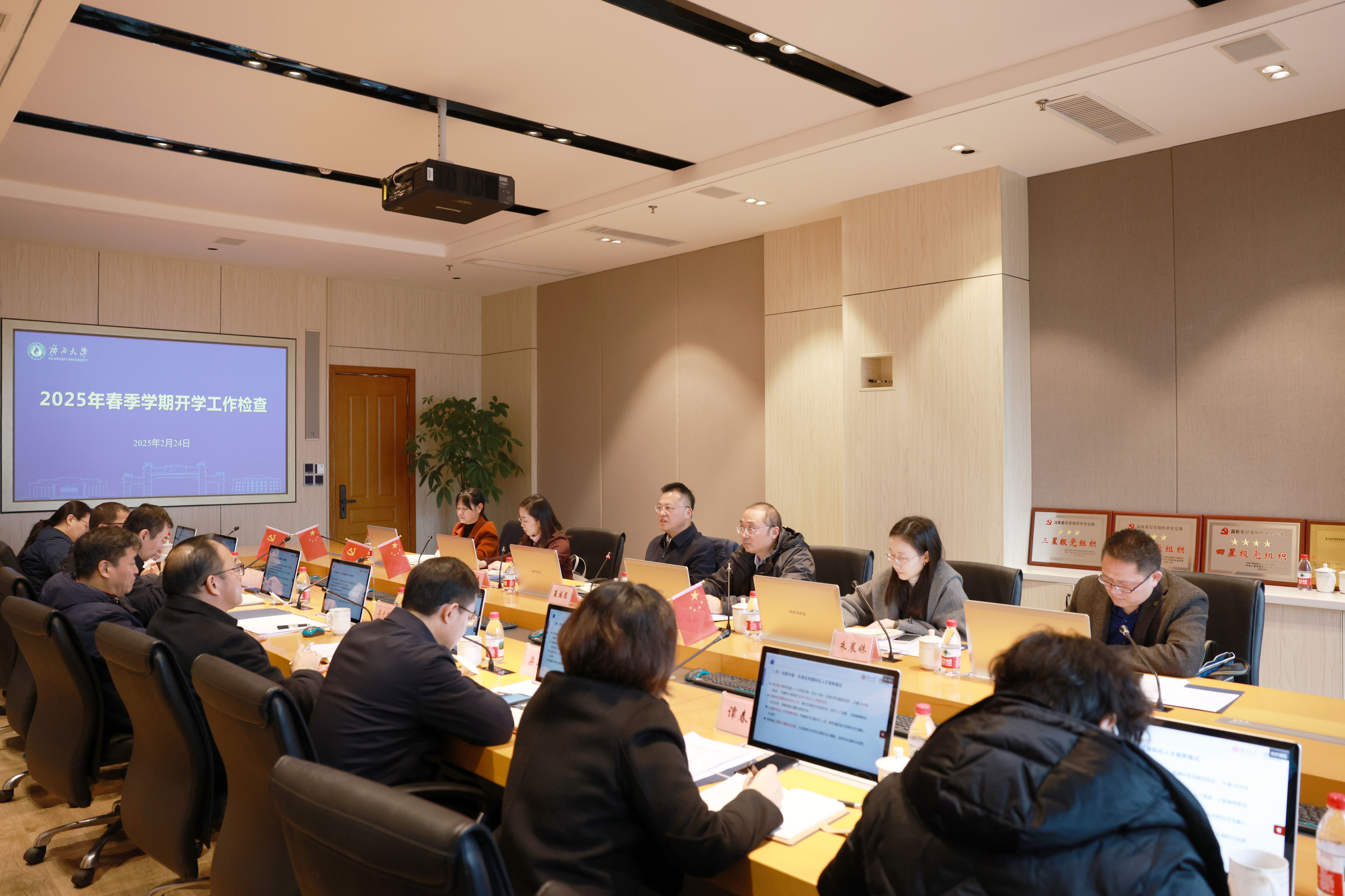 开展2025年春季学期开学工作检查。学院党委常务副书记罗诚、学术院长李光辉、常务副院长梁运文等学院班子成员,以及院长助理、各系主任、部门负责人等参加汇报会。