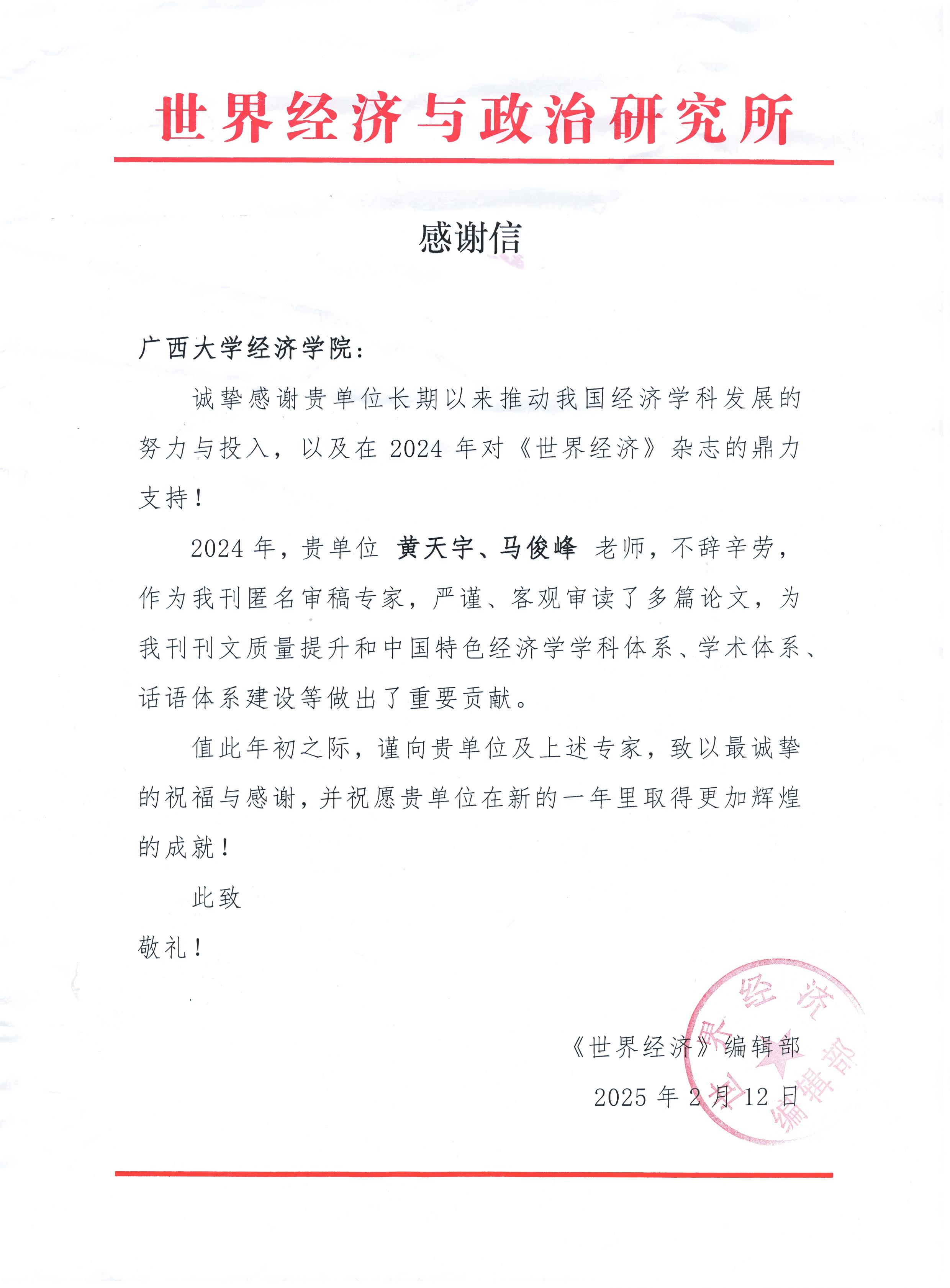 近日,世界经济与政治研究所《世界经济》编辑部向h视频 发来感谢信,感谢h视频 在2024年对《世界经济》杂志的鼎力支持,对h视频 教师黄天宇、马俊峰担任该刊匿名审稿专家期间的卓越贡献表示感谢。作为审稿人,他们以严谨的学术态度、深厚的专业素养和客观公正的评审标准,审读了多篇学术论文,为杂志的刊文质量提升做出了重要贡献,为中国特色经济学学科体系、学术体系、话语体系建设提供了有力支持。