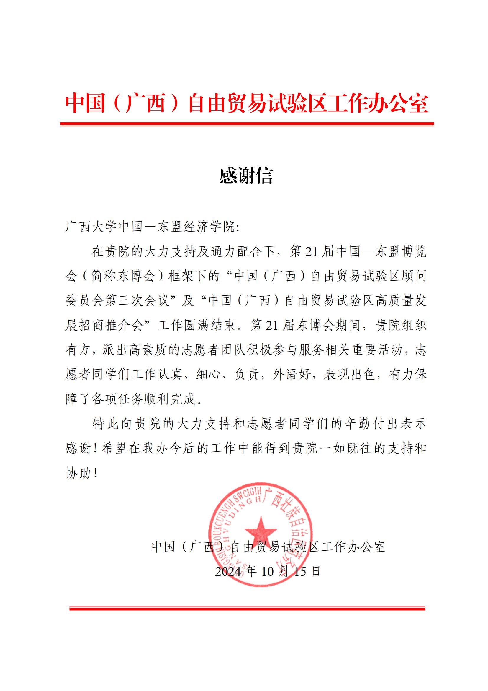 收到中国(广西)自贸区工作办公室发来感谢信