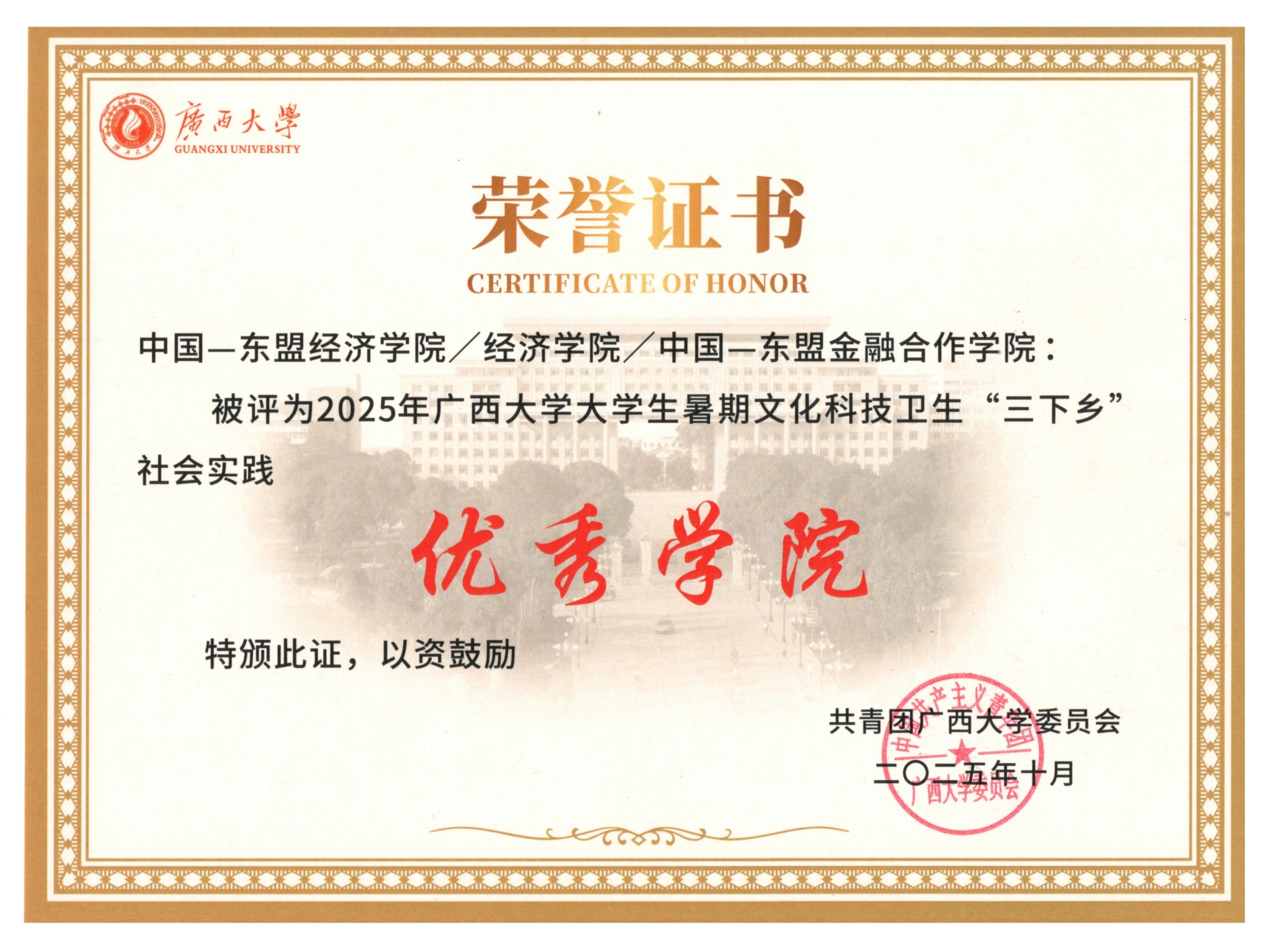 本院坚持“知行合一”的实践育人理念。五年来,累计组织寒暑假社会实践团队30余支,获校级重点项目8项,参与“扬帆计划”“返家乡”“三下乡”等实习实践学生800余人,推荐西部计划志愿者8人,获学校社会实践“优秀单位”荣誉。本院大力弘扬志愿精神,开展边疆经济学数据库建设、中国—东盟博览会和第一届学生(青年)运动会等志愿服务活动,收到中国(广西)自贸区工作办公室、广西国际博览事务局发来感谢信,志愿服务累计时长超3万小时,志愿者人次超3000人。广大青年在实践中深化了对边疆国情与东盟合作需求的认知,锤炼了跨文化沟通与实干能力,真正在服务国家战略、促进区域发展中挺膺担当,实现了专业所学与青春奉献的有机统一。