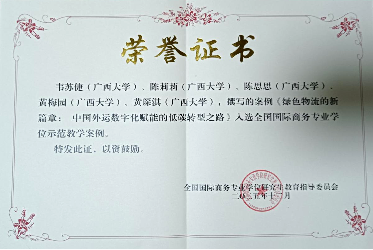 韦苏倢副教授带领研究生陈莉莉、陈思思、黄梅园和黄琛淇等共同开发的教学案例《绿色物流的新篇章:中国外运数字化赋能的低碳转型之路》成功入选。