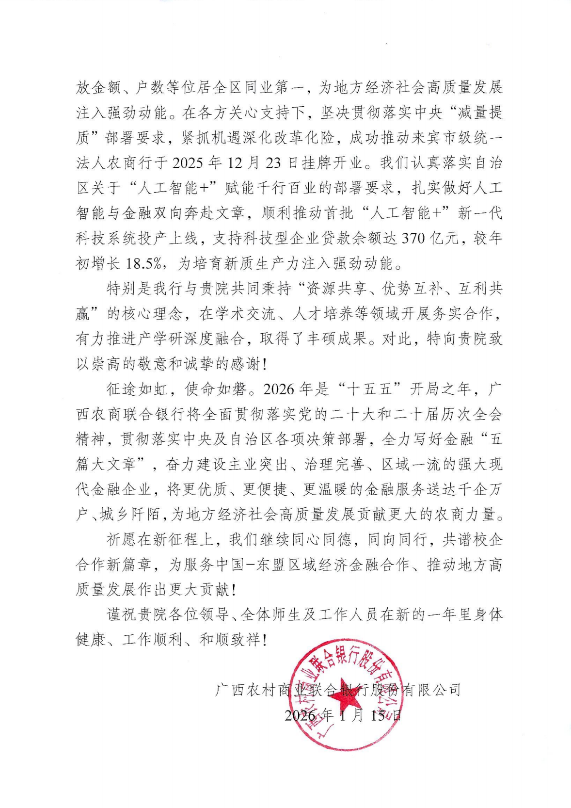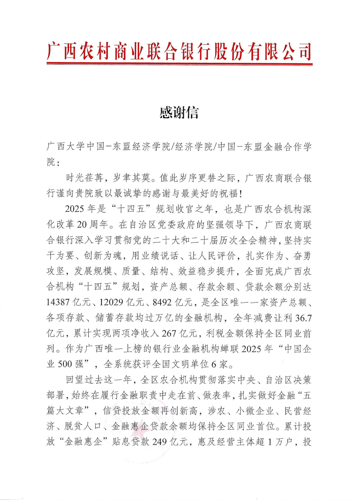 收到广西农商联合银行发来的感谢信。信中充分肯定了双方在学术交流、人才培养等领域的务实合作成果,并对学院在推动产学研深度融合、服务地方经济社会发展中所作出的贡献表示衷心感谢。