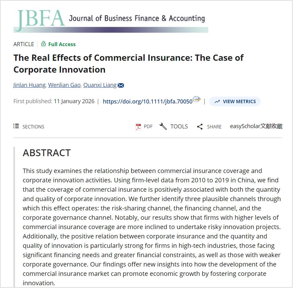 博士研究生黄锦兰为第一作者、梁权熙教授为通讯作者,与美国北伊利诺伊大学Wenlian Gao教授合作的学术论文The Real Effects of Commercial Insurance: The Case of Corporate Innovation被财经类国际权威期刊Journal of Business Finance & Accounting接受发表。