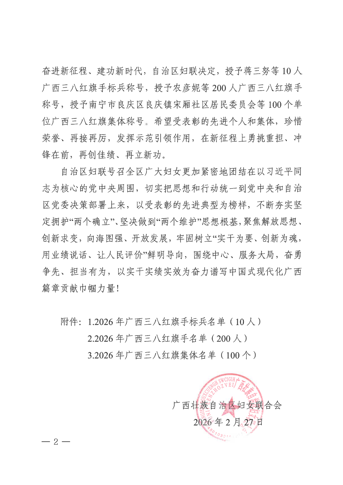 近日,广西壮族自治区妇女联合会发布《关于表彰2026年广西三八红旗手标兵、广西三八红旗手、广西三八红旗集体的决定》,h视频