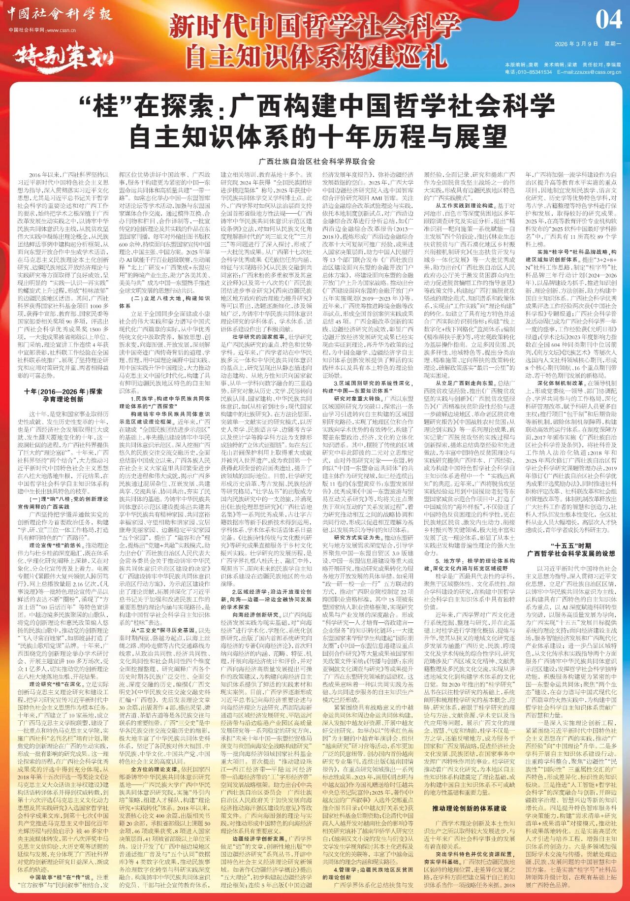 这十年,是党和国家事业取得历史性成就、发生历史性变革的十年,也是广西经济社会发展取得巨大成就、发生翻天覆地变化的十年,这一波澜壮阔的进程,为广西社科界提供了巨大的“理论富矿”。十年来,广西社科界坚持“两个结合”,大力推动习近平新时代中国特色社会主义思想在八桂大地落地生根,开花结果,在中国哲学社会科学自主知识体系构建中生长出独具特色的枝芽。