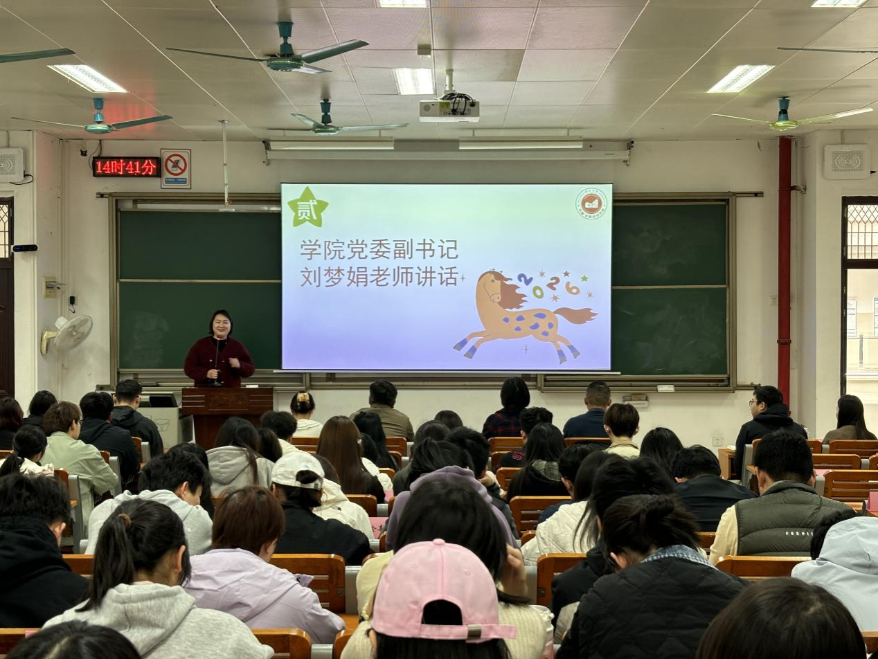召开2026年春季学期反诈主题教育暨全体学生干部大会,学院党委副书记刘梦娟、校保卫处金中州,学工组全体辅导员、团委学生会骨干及各班级学生干部参会。会议旨在提升学生反诈防范意识与能力,同时统筹部署新学期各项学生工作。