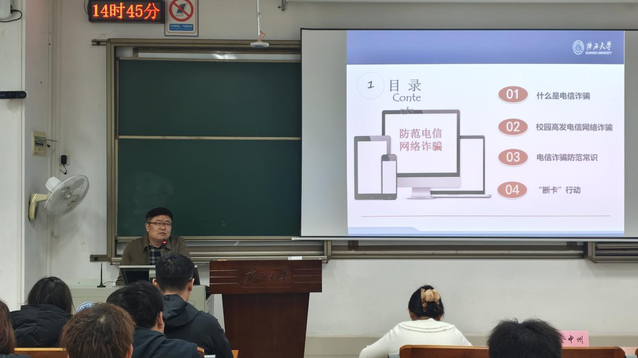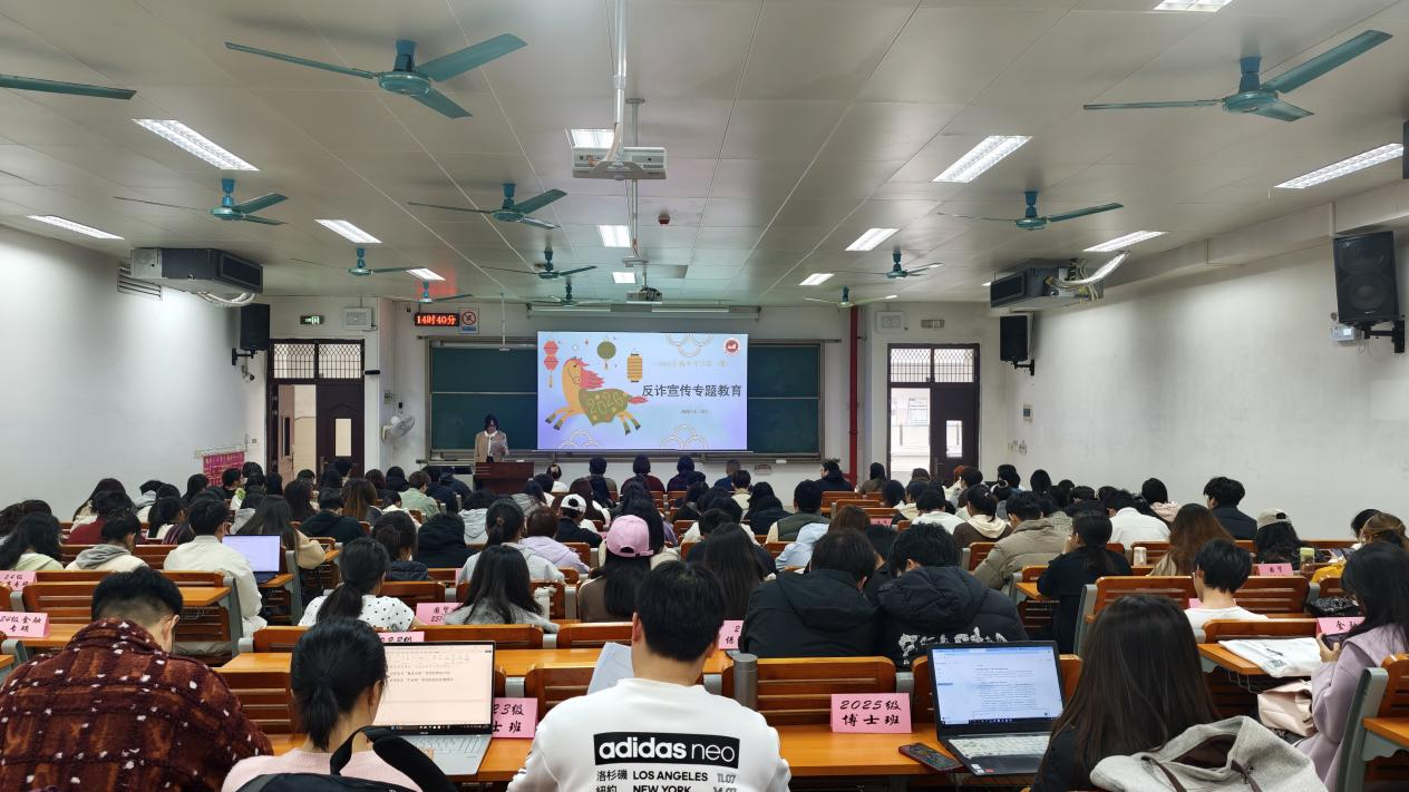 随后,保卫处金中州老师为与会师生带来反诈安全教育专题讲解。他结合近期校园高发的真实诈骗案例,详细剖析“刷单返利”“冒充客服”“虚假征信”等常见诈骗手法,拆解诈骗分子的作案套路与心理操控手段,同时给出切实可行的防范策略和应急处置建议,警示同学们时刻保持警惕,守护好个人财产与信息安全。