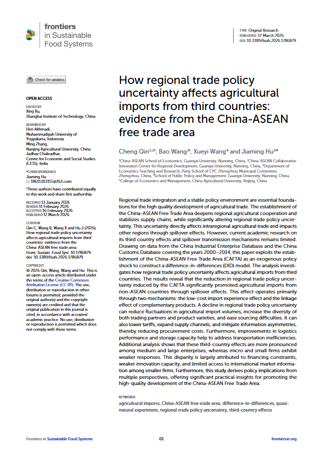 教师覃诚作为共同第一作者,与合作者共同完成的学术论文 “How regional trade policy uncertainty affects agricultural imports from third countries: evidence from the China-ASEAN free trade area”(《区域贸易政策不确定性如何影响自第三方国家的农产品进口——来自中国-东盟自由贸易区的经验证据》)在《Frontiers in Sustainable Food Systems》正式发表。该研究得到广西高校人文社会科学重点研究基地中国—东盟区域发展协同创新中心基金项目(CWYB202405)、h视频