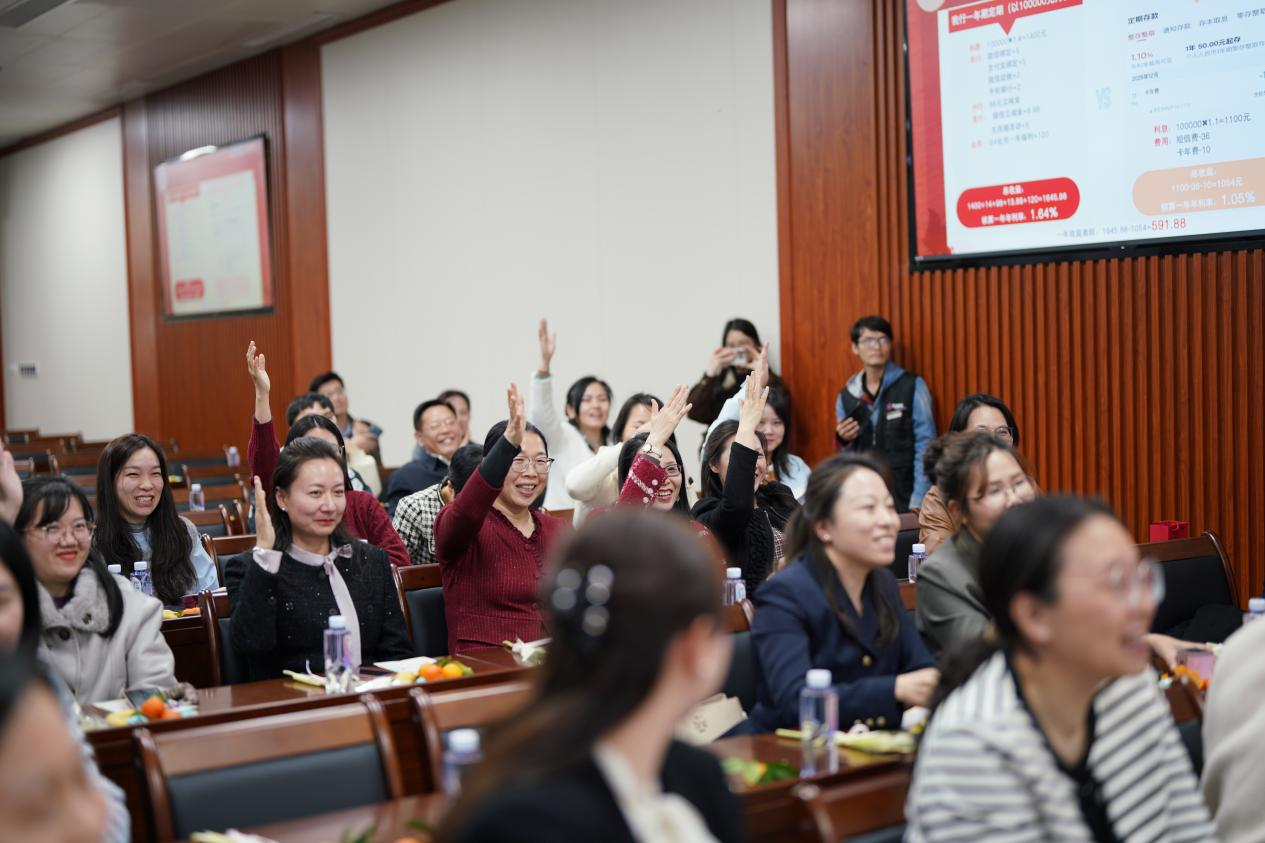 活动现场布置温馨雅致,鲜花馥郁、果香四溢,处处洋溢着喜悦氛围。桂林银行明秀路支行团队结合当前经济形势,为老师们带来了一场深入浅出的金融知识分享,并进行了反诈宣教和互动问答。内容生动详实,贴近生活,有效提升了大家的理财和反诈意识,助力规划美好未来。