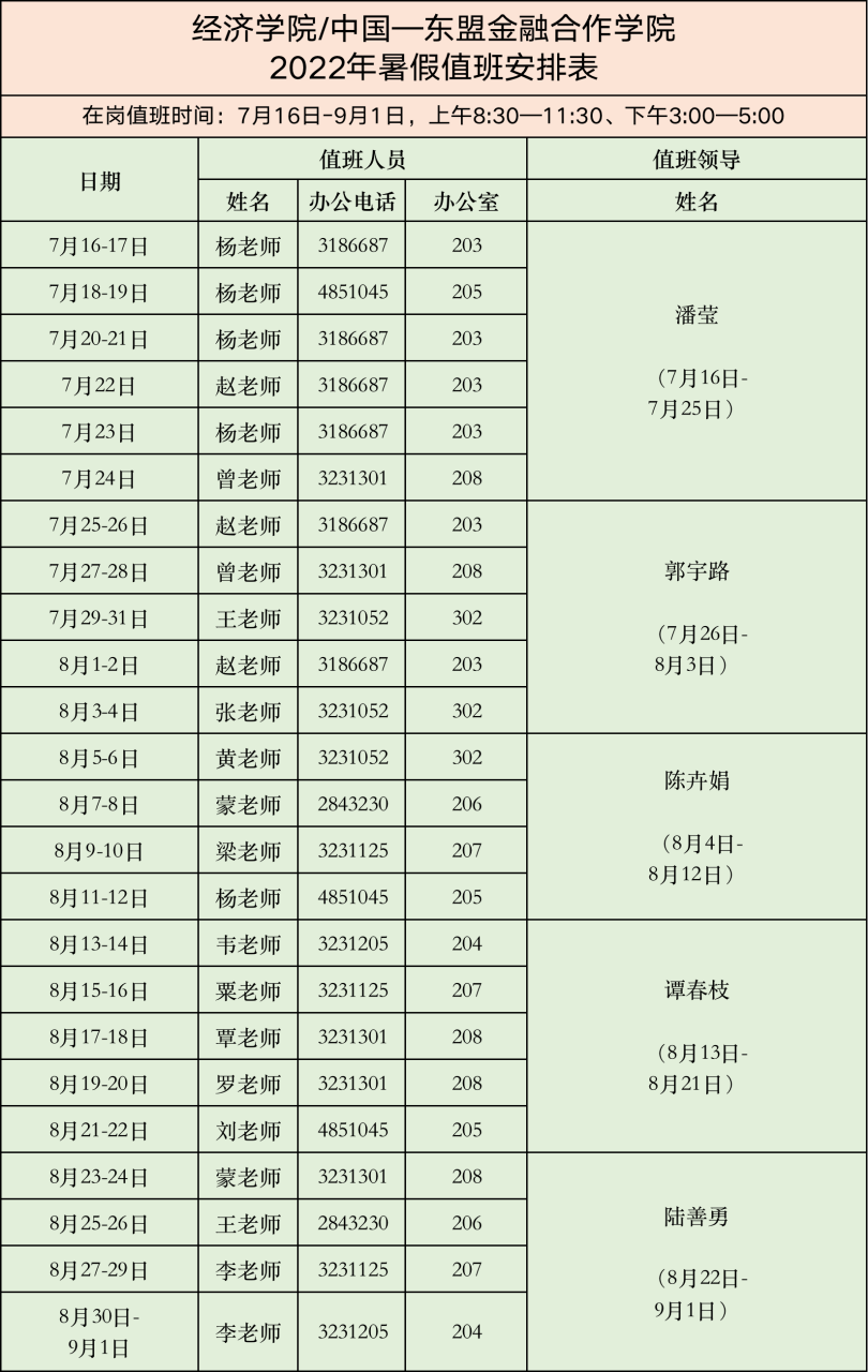 h视频 /中国-东盟金融合作学院 2022年暑假值班安排表
