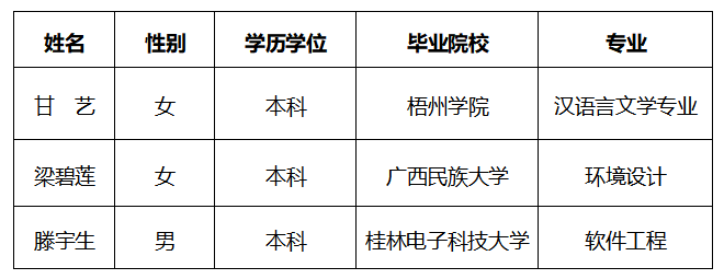 通过广西四方汇通人才服务有限责任公司面向社会公开招聘劳务派遣制工作人员3名,根据相关工作方案,经初筛、笔试、面试、复试等程序,现将拟聘用人员公示如下:
