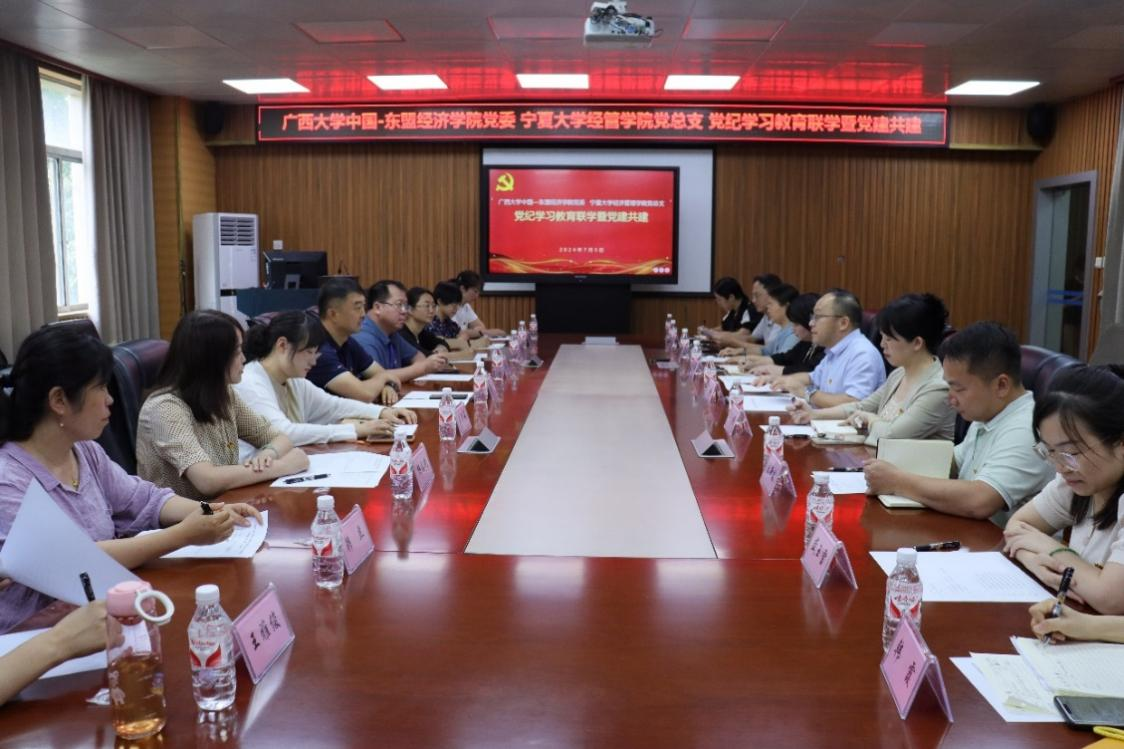 党委与宁夏大学经济管理学院党总支在MBA大楼314会议室开展党纪学习教育联学暨党建共建活动。学院党委常务副书记罗诚,党委副书记、纪委书记陈卉娟,党委委员、副院长杨璞,各教工党支部书记及党员教师代表同宁夏大学经济管理学院党总支书记赵军,教育与社会学部党委副书记、副部长房彦兵,经济管理学院党员教师代表等20余人进行座谈交流。罗诚主持座谈交流活动。