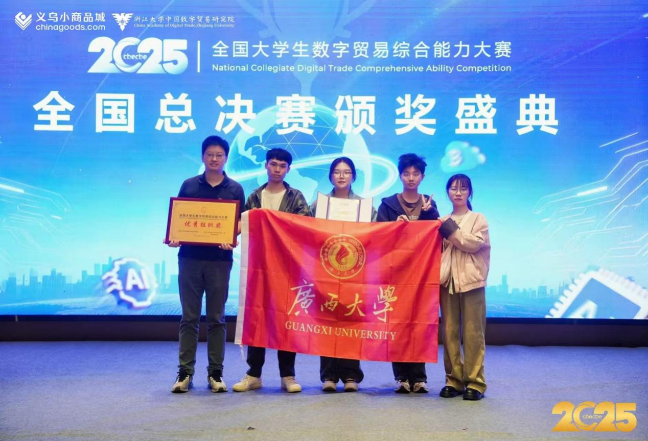 The 2025 National Finals of the the National Collegiate Digital Trade Comprehensive Ability Competition recently concluded successfully. After intense preliminary and provincial rounds, the graduate student team "Heng Nei Xiang Bu Gan Liao Tian" and the undergraduate team "Zui Ba Jia Ren Cheng Shuang Dui" of China-ASEAN School of Economics stood out in the regional selection round with their ou...